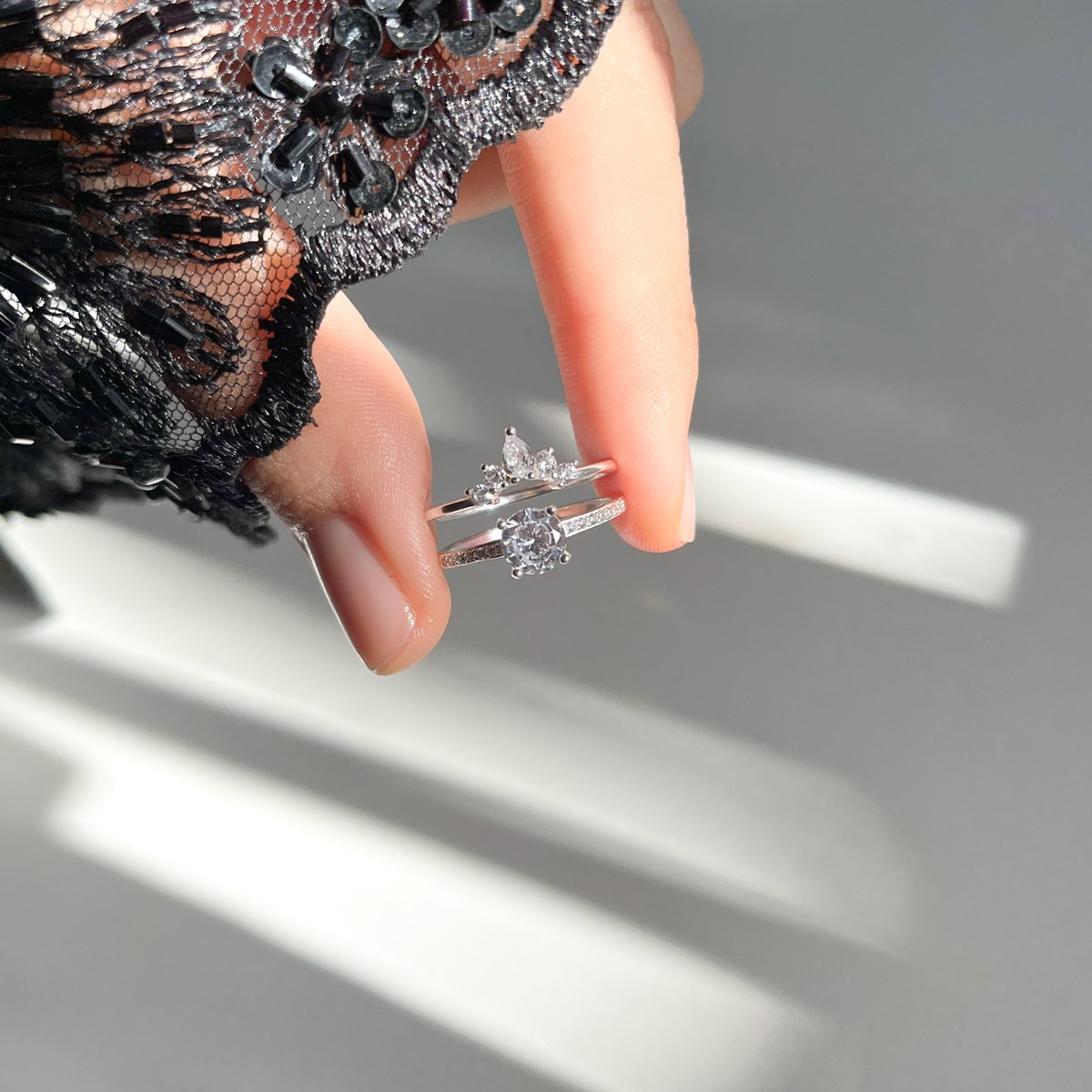 Set de anillos de plata 925. Este conjunto incluye una sortija tipo solitario y una alianza con diseño de corona (tiara), ideales para usarse juntas en un estilo set de novia o por separado.