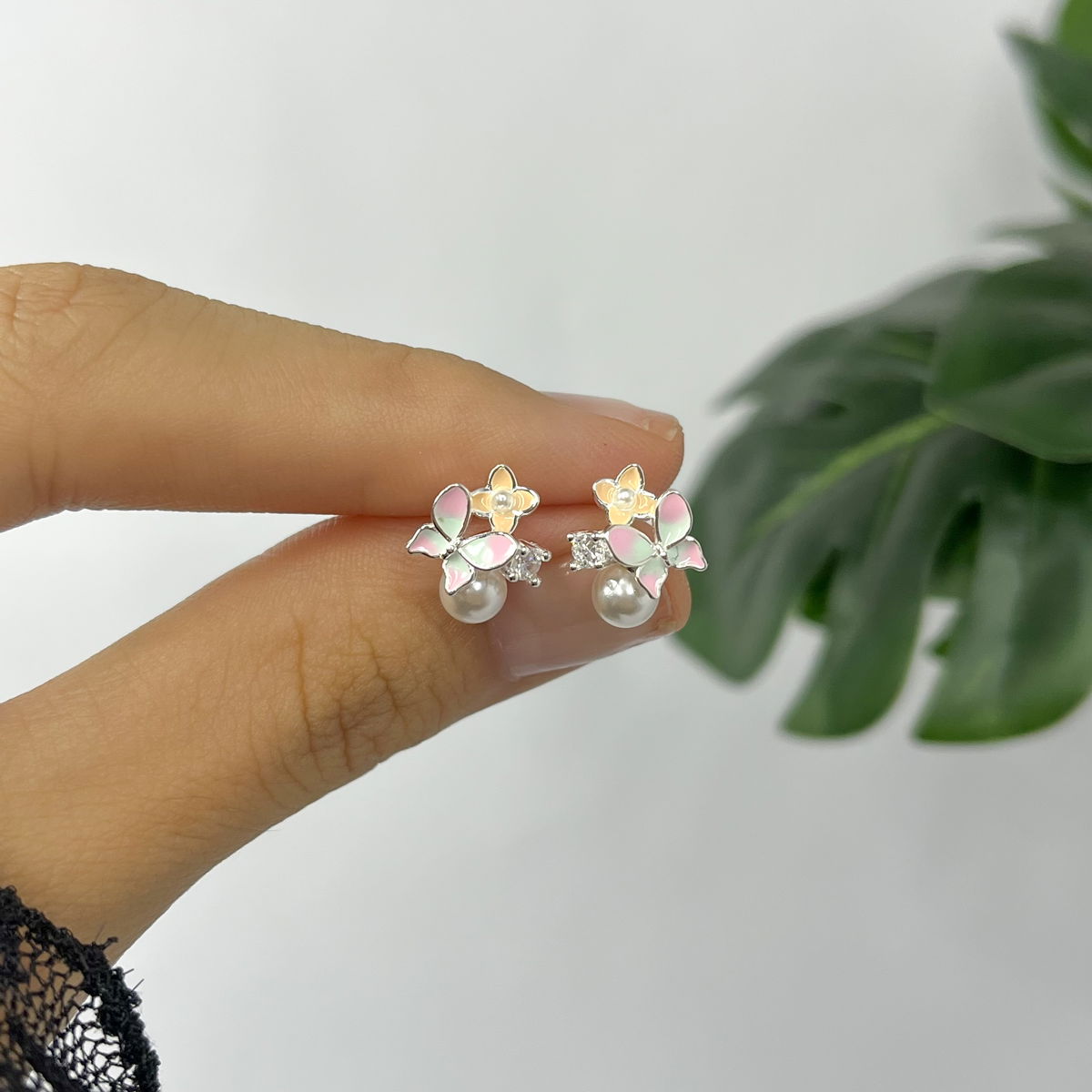 Aros de mariposas, flor y perla